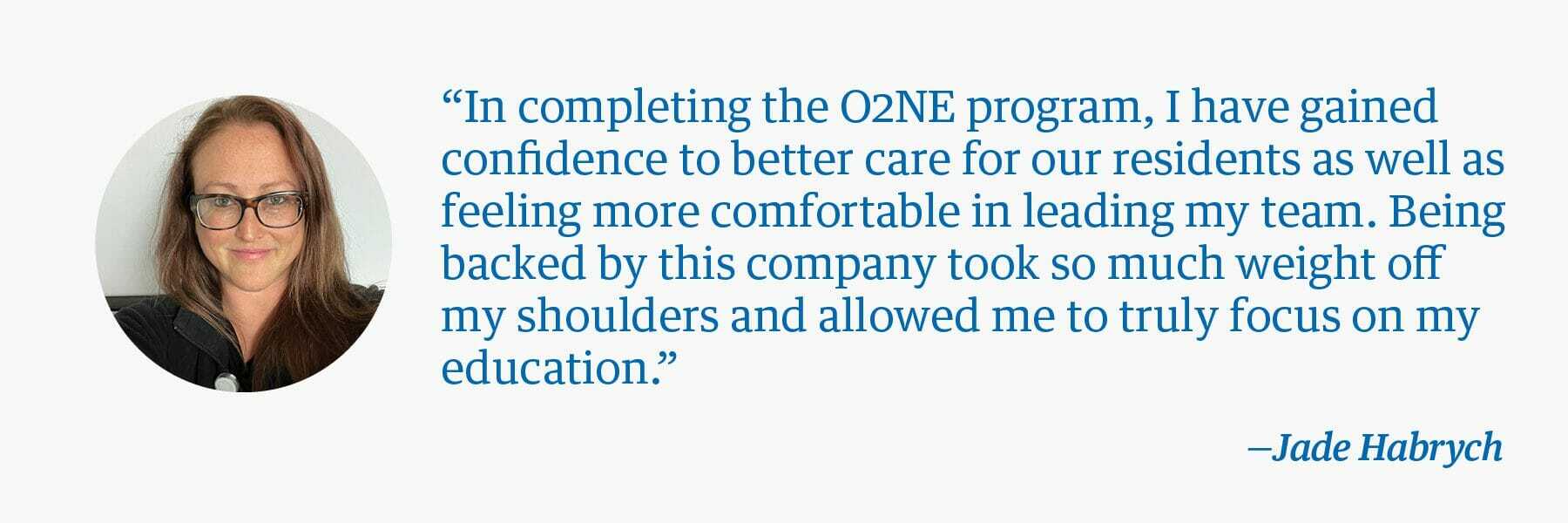 The program aids front-line caregiver staff to achieve new levels of credentialing and ability, ultimately improving the entire senior healthcare system. Some O2NE graduates have moved upward into clinical management positions, evidence that the pathway created by this scholarship program advances career potential for these students. Multiple program graduates have fueled their potential, becoming Directors of Nursing, Regional Clinical Directors, and many additional versatile roles within the healthcare community.