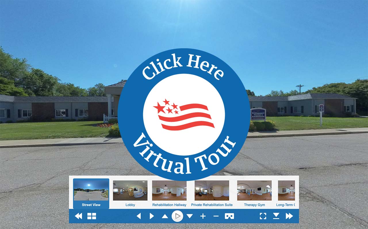 We invite you to explore Williamsport Nursing & Rehabilitation. You will be able to experience an in-person walk-through from the comfort of your own home, office or wherever your mobile device or computer takes you. We invite you to take this journey and picture yourself or your loved one in our community. If you would like assistance navigating through the special places that our residents love, we proudly offer live guided tours. Contact us today to schedule time with one of our caring team members.